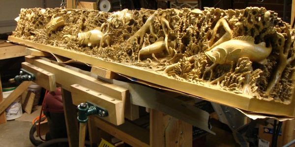 "Survival" mantel was designed and carved by Jerry for our customer in Houston, TX, who added a plexiglass top to the installed mantel, so that the light would shine down through the top of the wood carving into the "water."